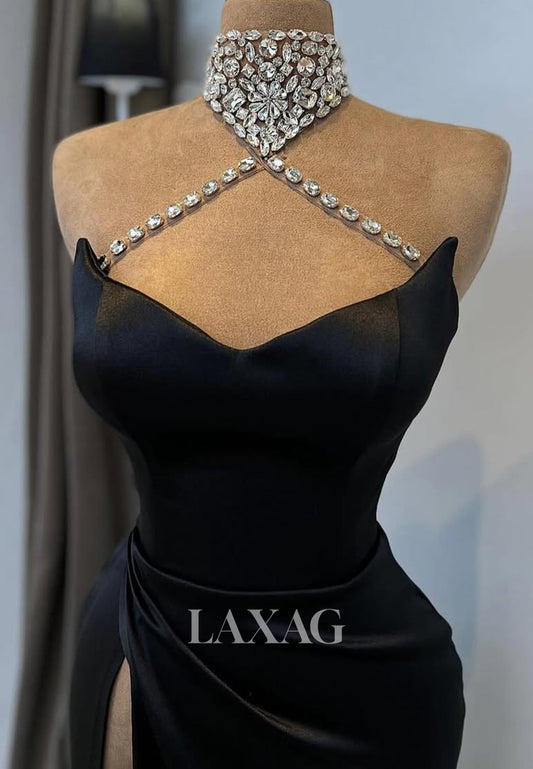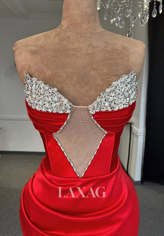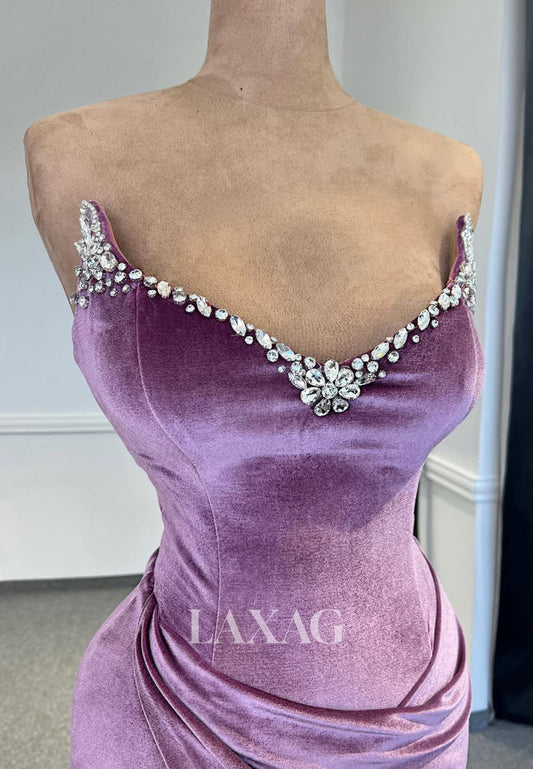 Sweetheart Sleeveless Pleated Floor-Length Party Gowns Rhinestone Mermaid Prom Dress with High Slit