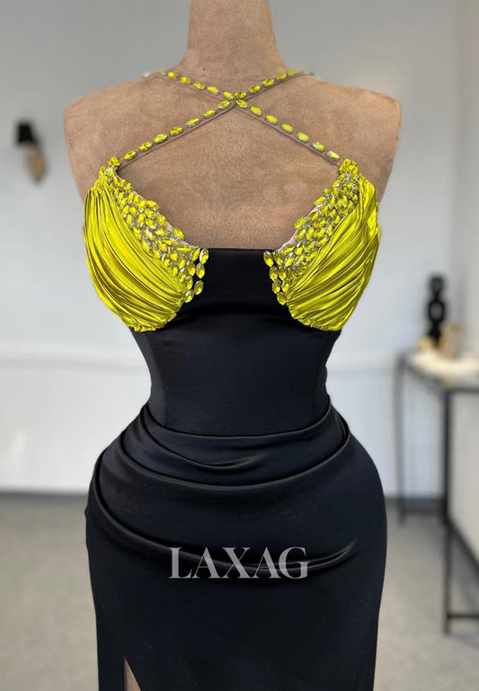 Halter V-Neck Sleeveless Satin Mermaid Prom Dress Rhinestone Beaded Floor-Length Formal Gowns