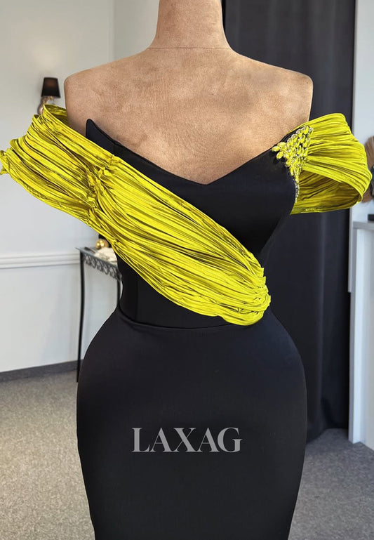 Beaded V-Neck Off-Shoulder Sleeveless Mermaid Prom Dress Floor-Length Pleated Satin Evening Gowns