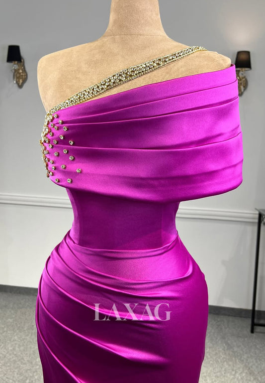 Off-Shoulder Asymmetrical-Neck Sleeveless Evening Gowns Beaded Pleated Slit Satin Mermaid Prom Dress