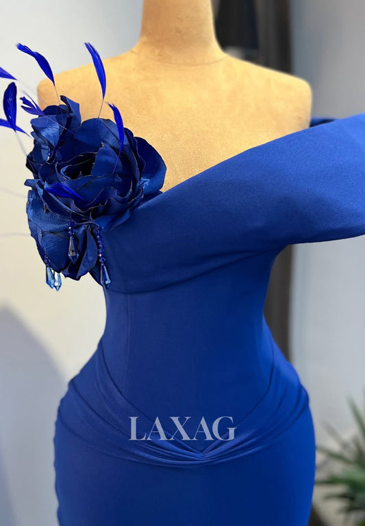 Asymmetrical-Neck Off-Shoulder Sleeveless Mermaid Prom Dress Floral Embellished Pleated Formal Gowns