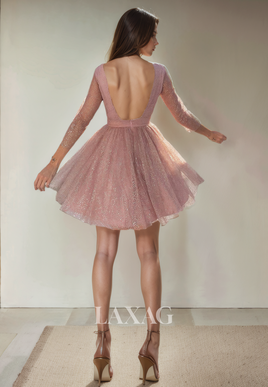 A-Line Bateau Long Sleeves Open Back Glitter Tulle Party Homecoming Dress