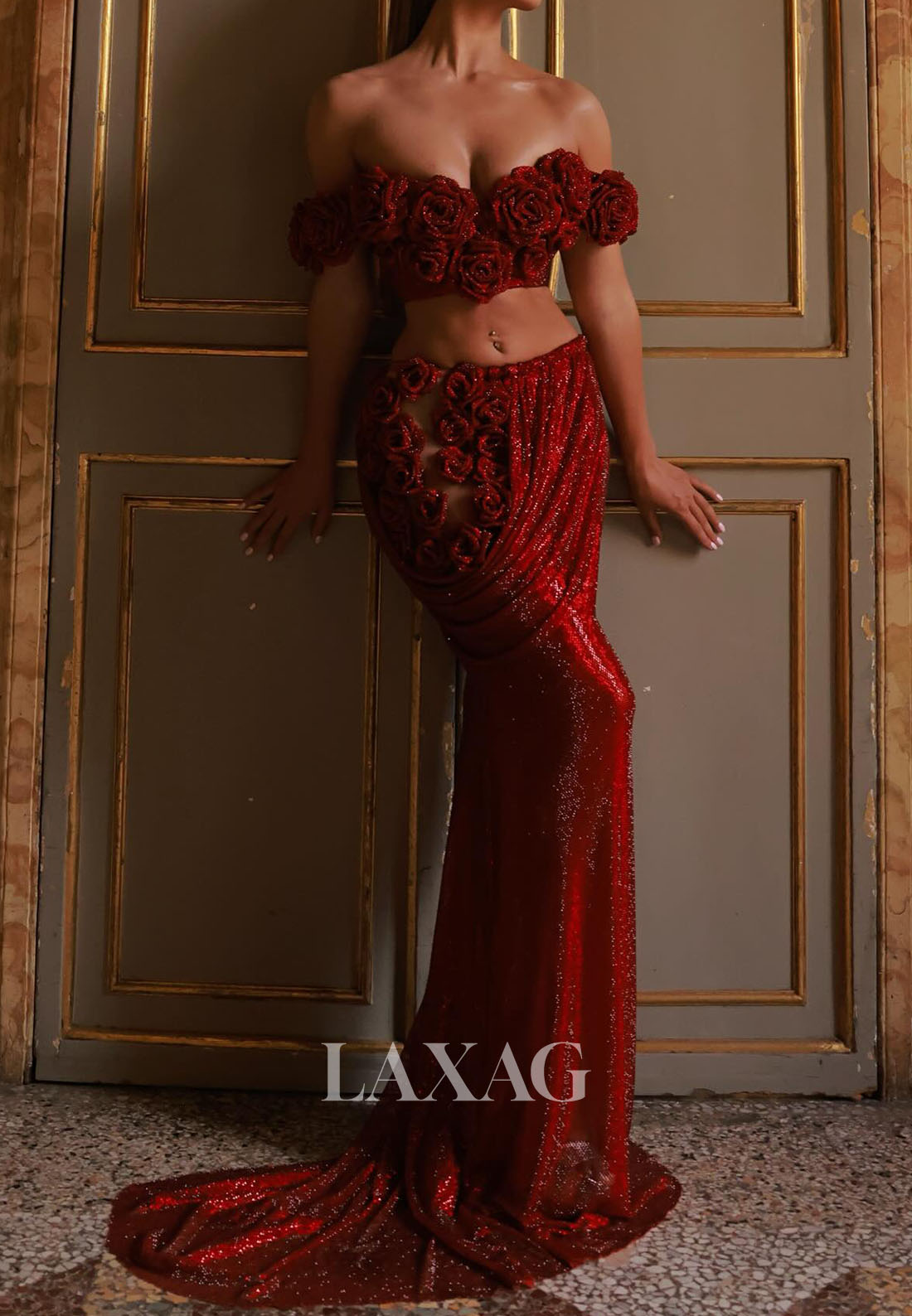 Sweetheart Pleated Fully Sequined Mermaid Prom Dress Floral Embellished Two Piece Party Gowns