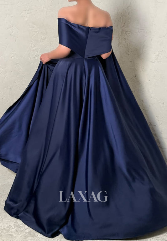 Bateau-Neck Off-Shoulder Sleeveless Satin Pleated A-Line Party Prom Dress with High Slit