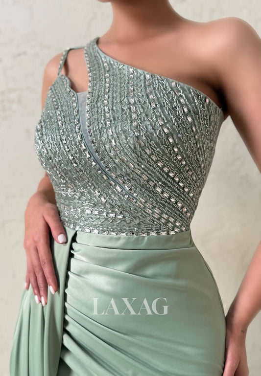 Asymmetrical-Neck One-Strap Sleeveless Rhinestone Beaded Satin Floor-Length Mermaid Prom Dress