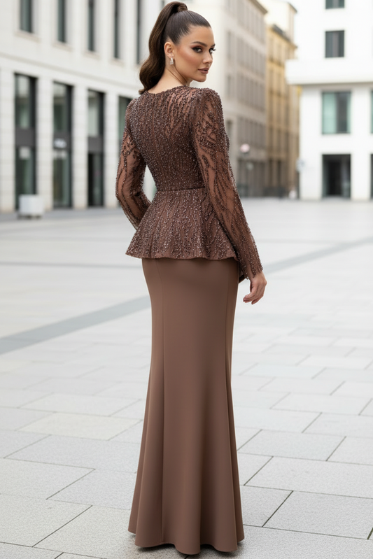 Bateau-Neck Long-Sleeves Mermaid Evening Dress Floor-Length Satin&Tulle Pleated Formal Gowns