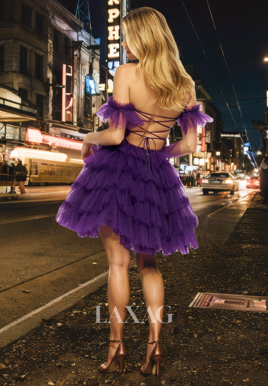 A-Line Off Shoulder Tulle Tiered illsuion Elegant Party Homecoming Dress