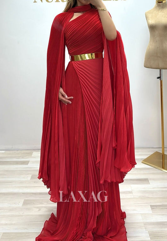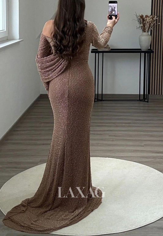 Long-Sleeves Asymmetrical-Neck Pleated Formal Gowns Fully Beaded Sweep Train Mermaid Evening Dress
