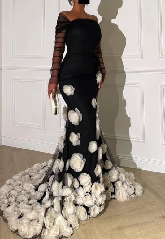 Tube Top Long-Tulle-Sleeves Mermaid Evening Dress Floral Embellished Floor-Length Formal Gowns