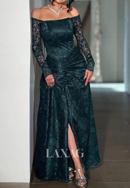 Bateau-Neck Long-Sleeves Allover Lace Formal Gowns Floor-Length Pleated Mermaid Evening Dress
