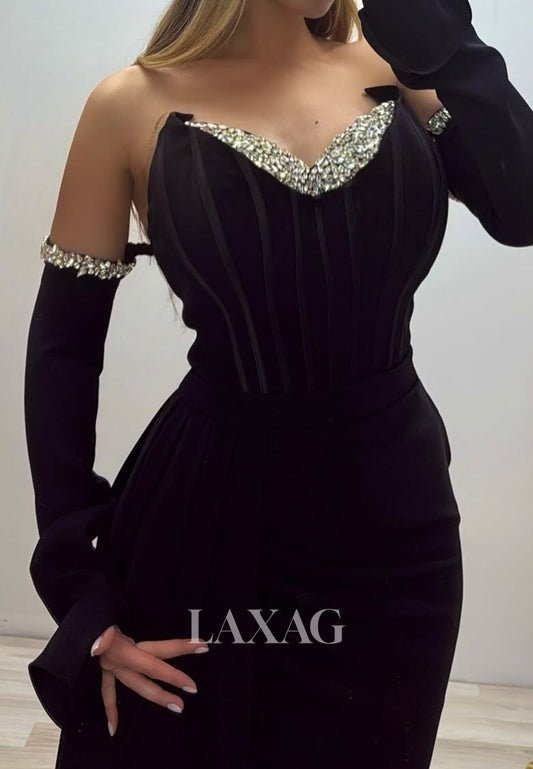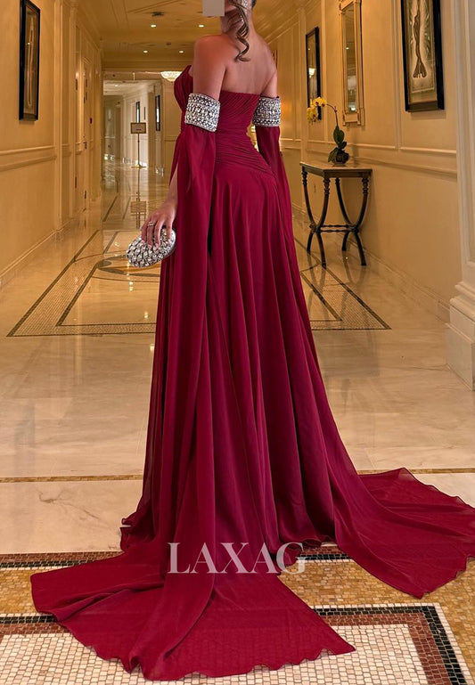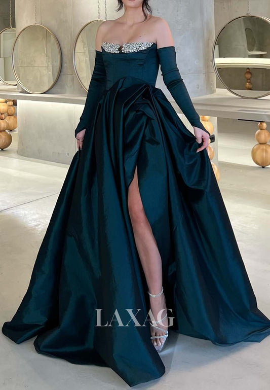 Beaded Tube Top Off-Shoulder Pleated Formal Gowns High Slit A-Line Evening Dress with Gloves