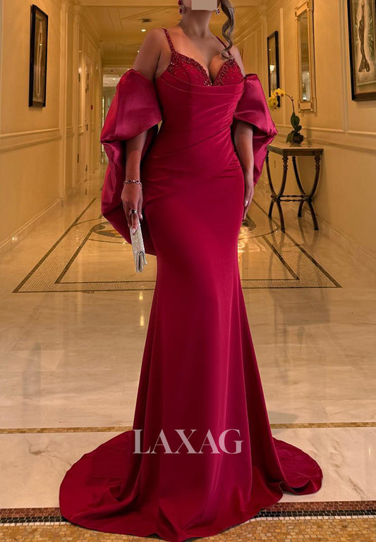 Spaghetti Straps Sweetheart Sleeveless Beaded Pleated Satin Mermaid Evening Dress