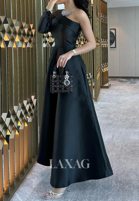 Asymmetrical-Neck One-Long-Sleeves A-Line Evening Dress Off-Shoulder Pleated Satin Formal Gowns