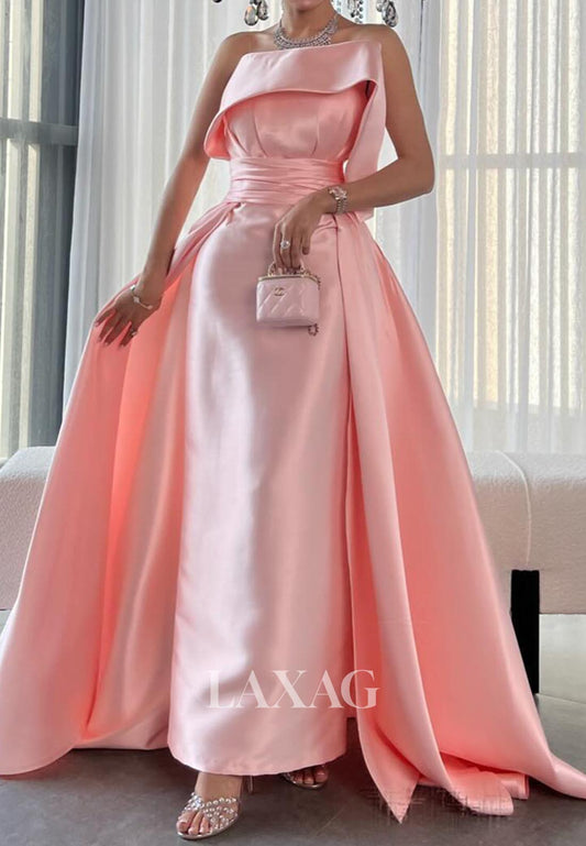 Tube Top Off-Shoulder Sleeveless Floor-Length Pleated Satin Mermaid Evening Dress with Overskirt