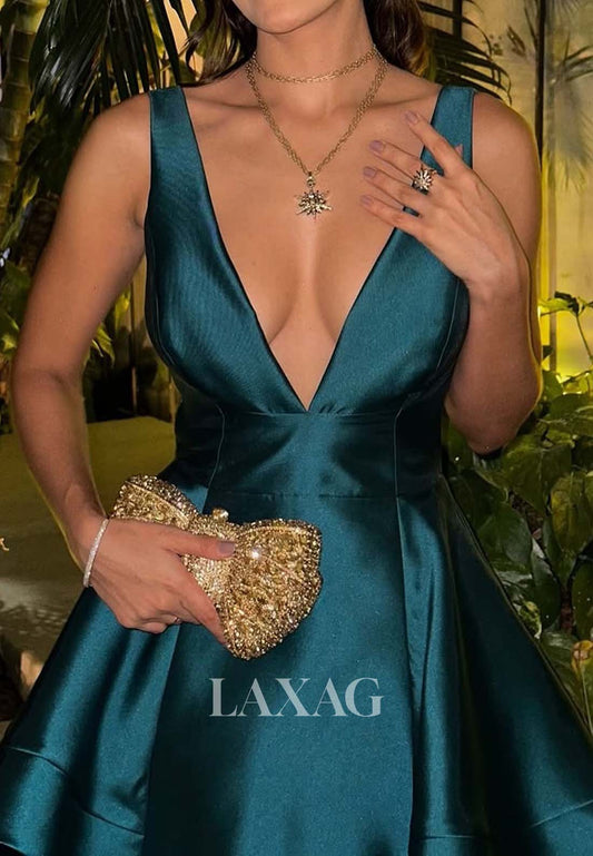 Deep V-Neck Straps Sleeveless A-Line Prom Dress Off-Shoulder Satin Pleated Tiered Evening Gowns