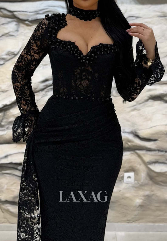 Sweetheart Long-Sleeves Pleated Mermaid Prom Dress Allover Lace Beaded Floor-Length Formal Gowns