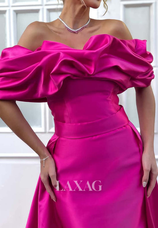 Beaded-Sweetheart Off-Shoulder Mermaid Evening Dress Long-Sleeveles Pleated Satin Formal Gowns