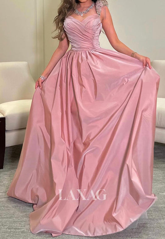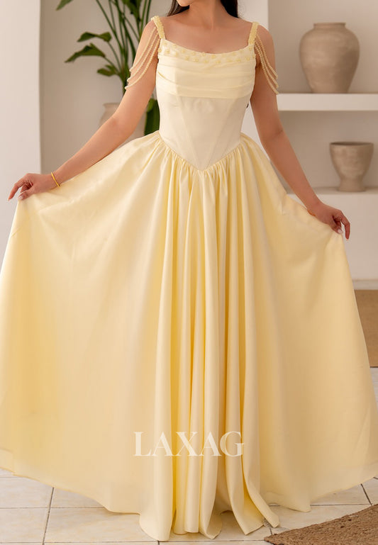 Spaghetti Straps Sleeveless A-Line Evening Dress Off-Shoulder Beaded Pleated Satin Formal Gowns