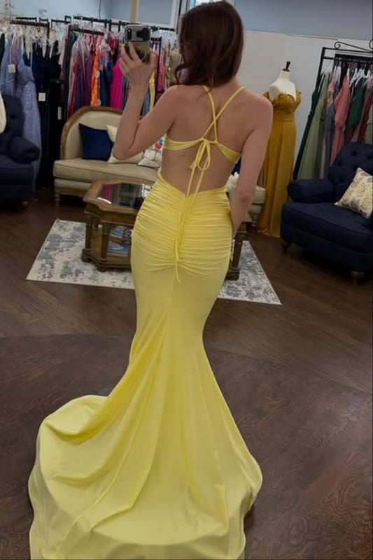 Simple Halter Deep V-Neck Sleeveless Satin Pleated Floor-Length Mermaid Prom Dress