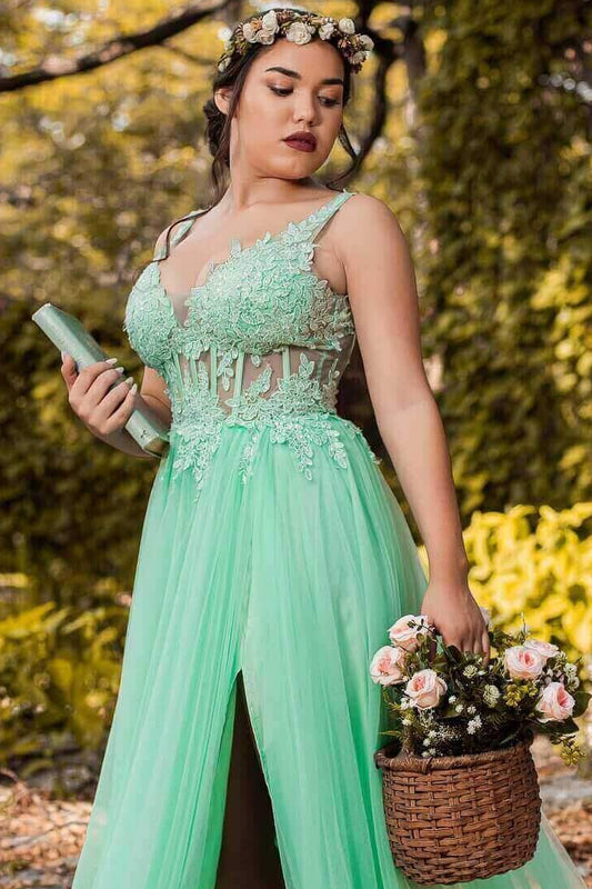 Deep V-Neck Spaghetti Straps Beaded Applique Tulle Pleated High Slit A-line Prom Dress