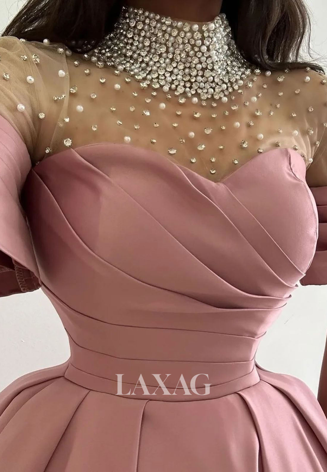 High-Neck Short-Sleeves A-Line Prom Dress Beaded Sheer Pleated Satin&Tulle Party Gowns