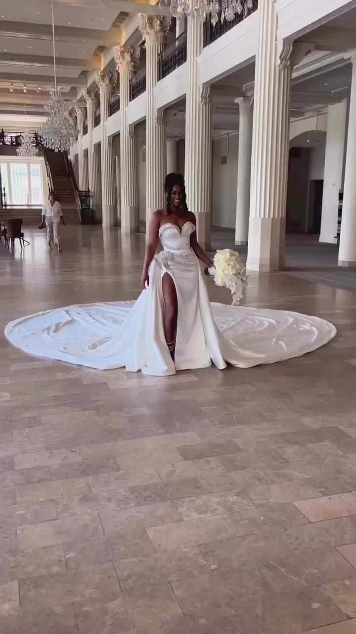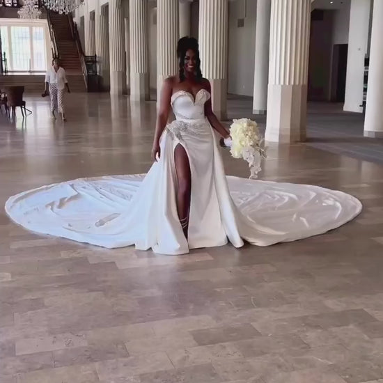 This elegant sweetheart off-shoulder wedding dress features delicate beading and a pleated satin design that beautifully contours your silhouette. The sleeveless mermaid style enhances your figure, while the flowing train adds a touch of timeless romance. Perfect for making a stunning entrance on your special day.