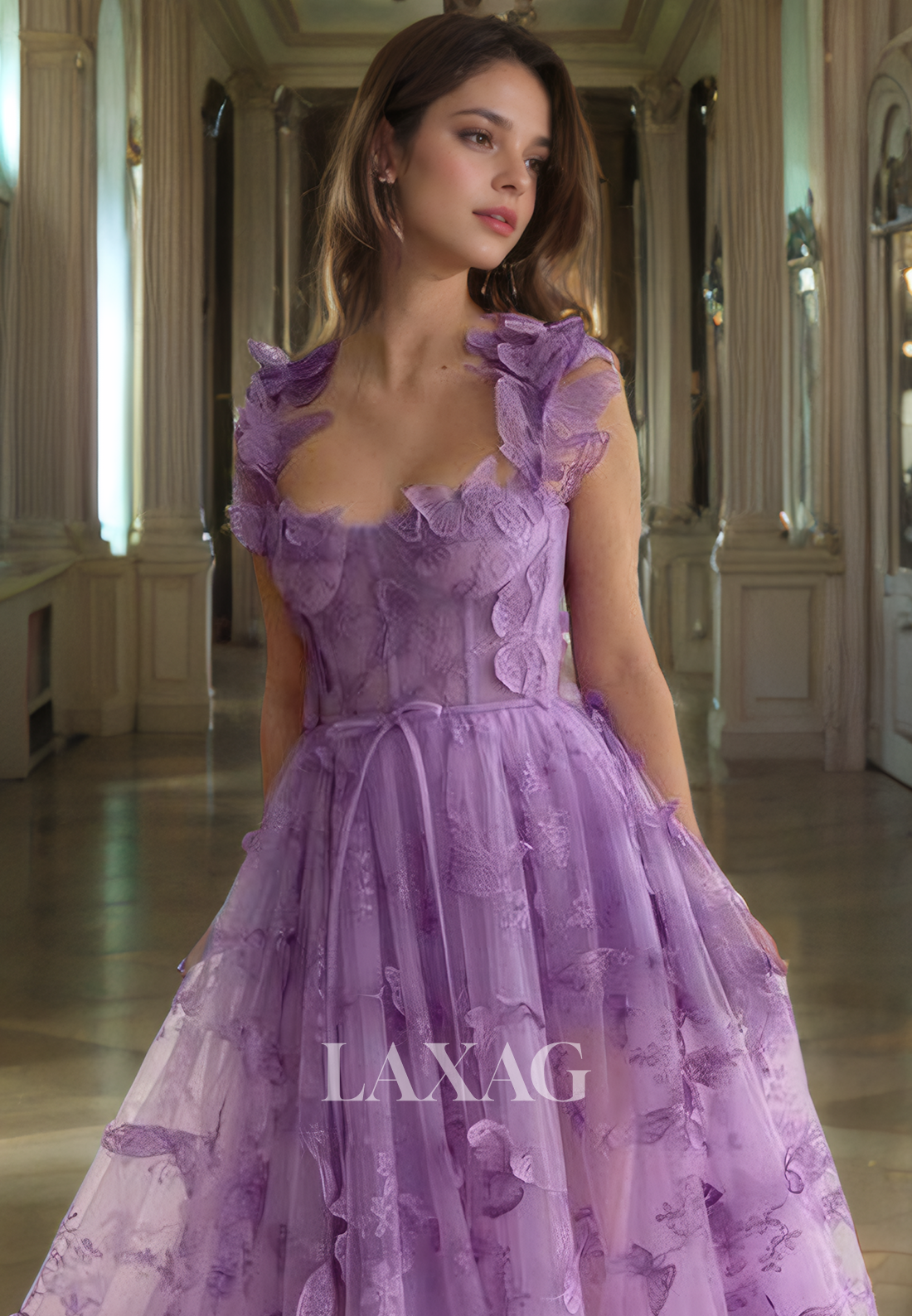 This A-Line dress features delicate straps, flowing tulle, intricate appliques, and a high slit for a glamorous look. Perfect for parties, prom, and formal evening events.