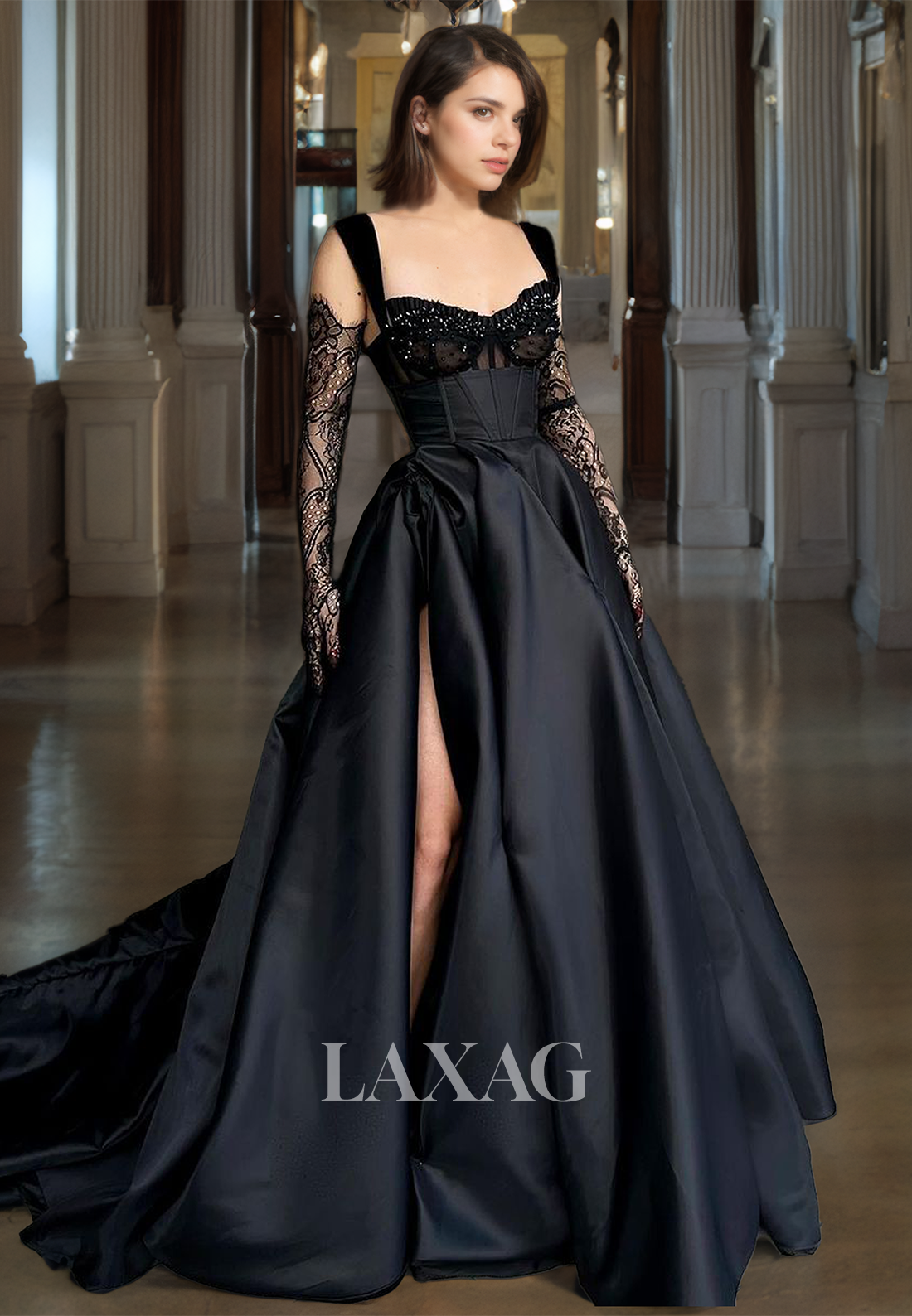 Black Long Party Dress A-Line Sweetheart Empire Waist Lace Satin Black Prom Dress