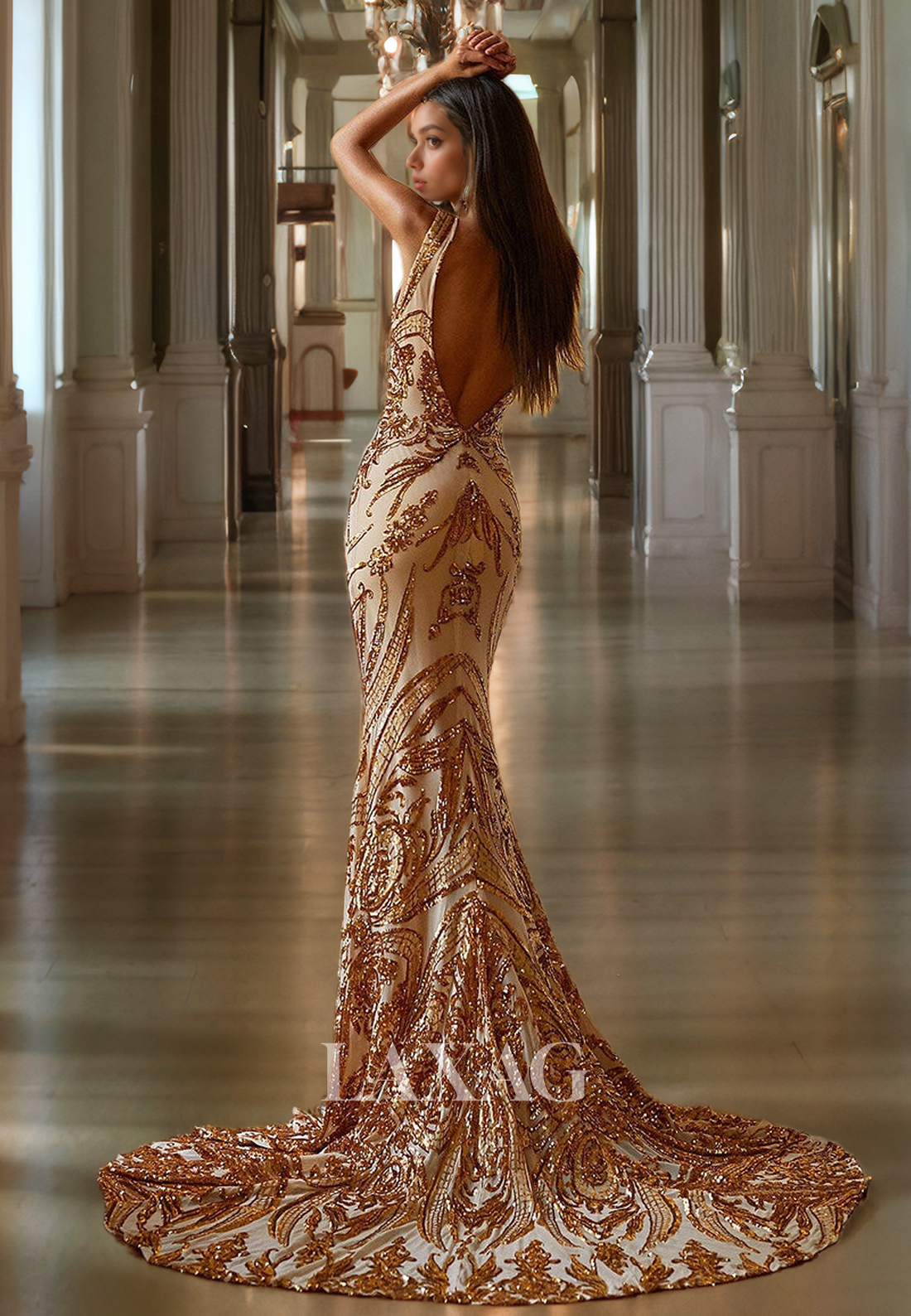 Low-V-Neck Prom Dress Inspiration Sequin Sleeveless Sheath&Column Long Formal Party Dress