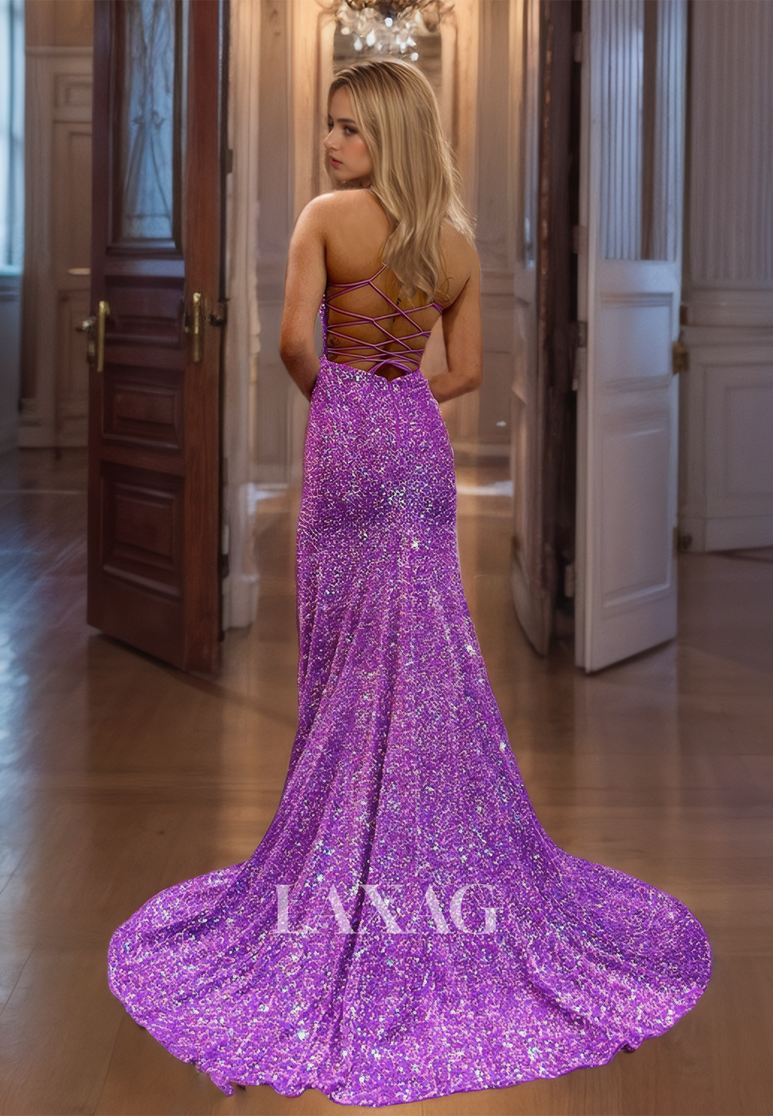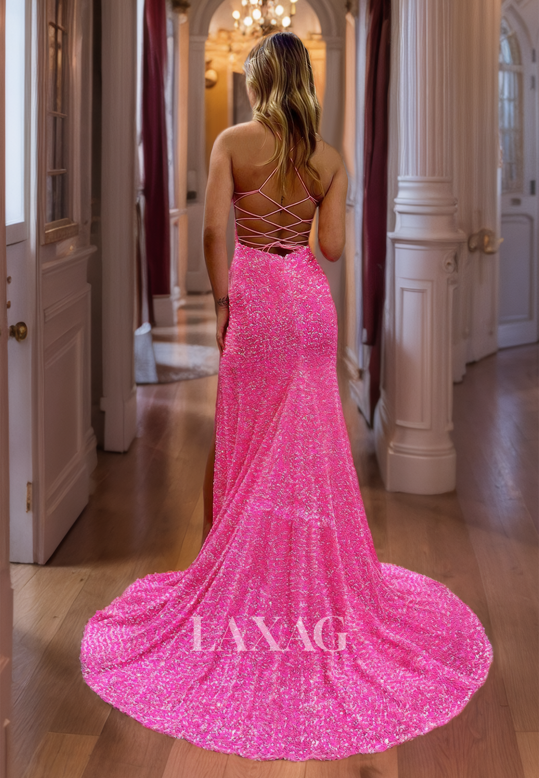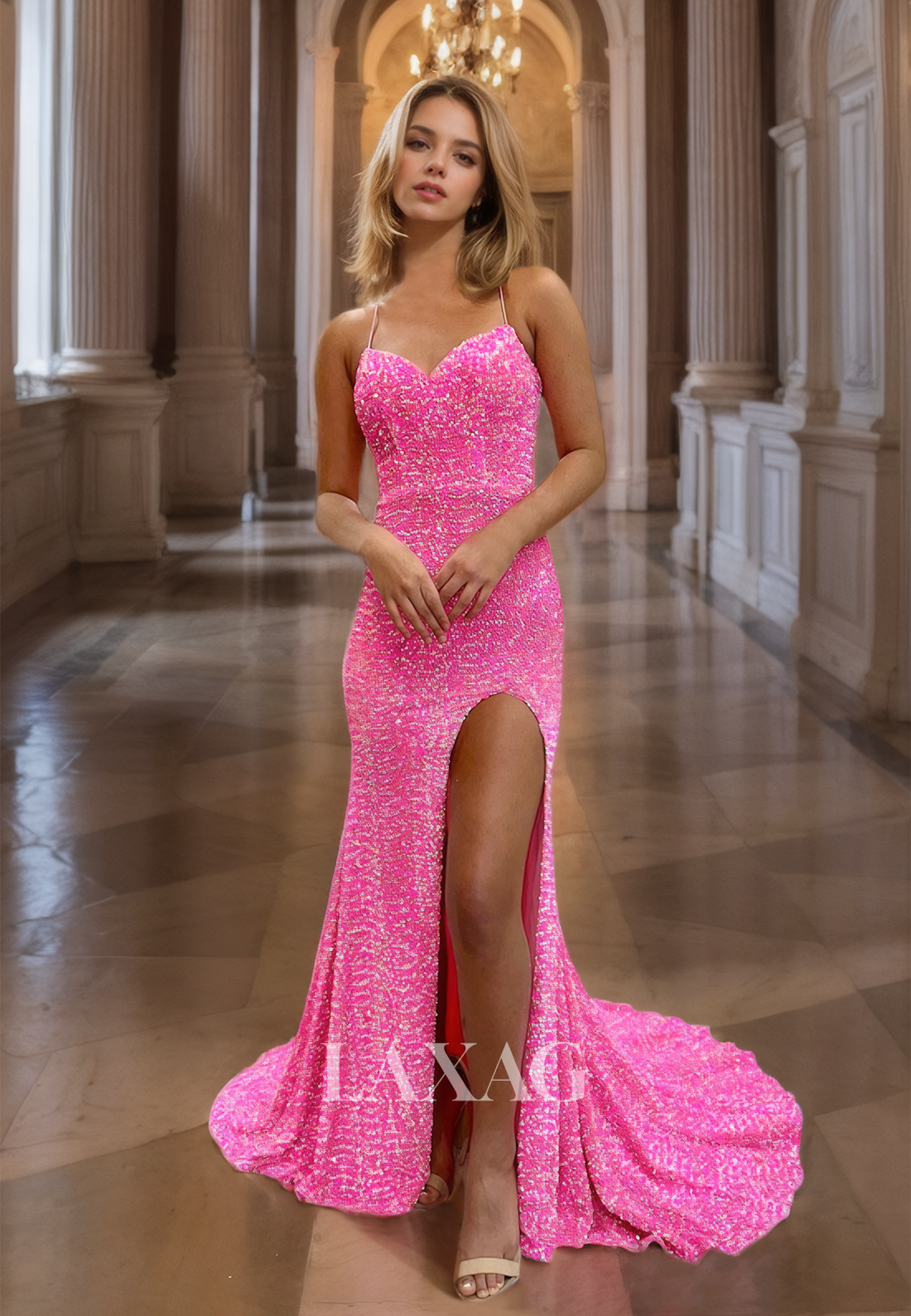 Sparkly Sequined Prom Dress Sheath&Column High Slit V-Neck Formal Party Dress