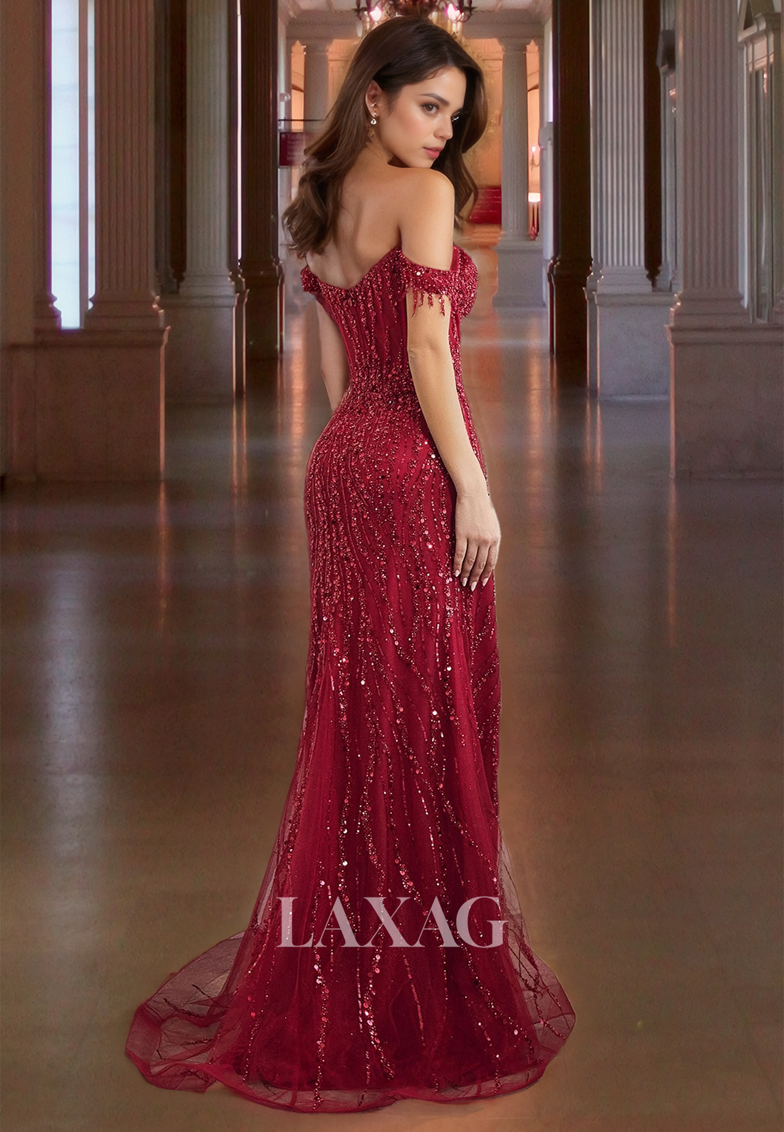 Sweetheart Off-Shoulder Sleeveless Mermaid Prom Dress Fully Beaded High Slit Formal Gowns