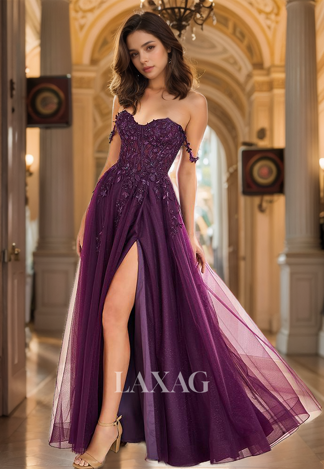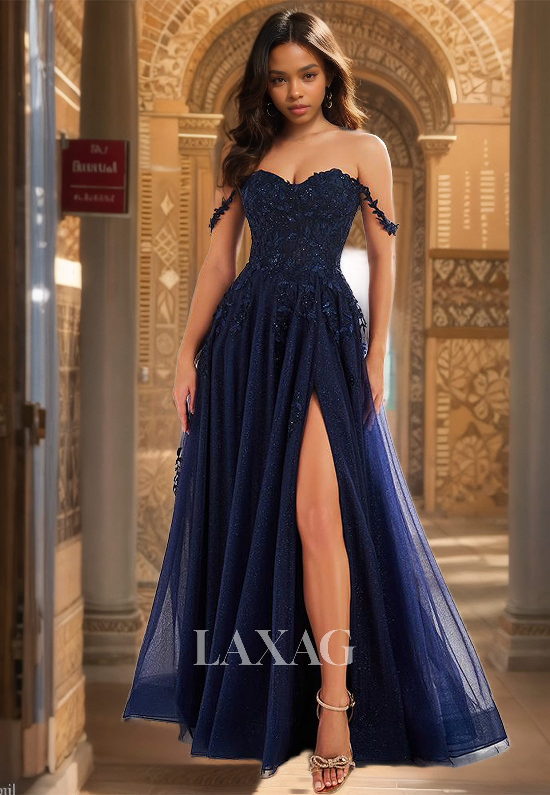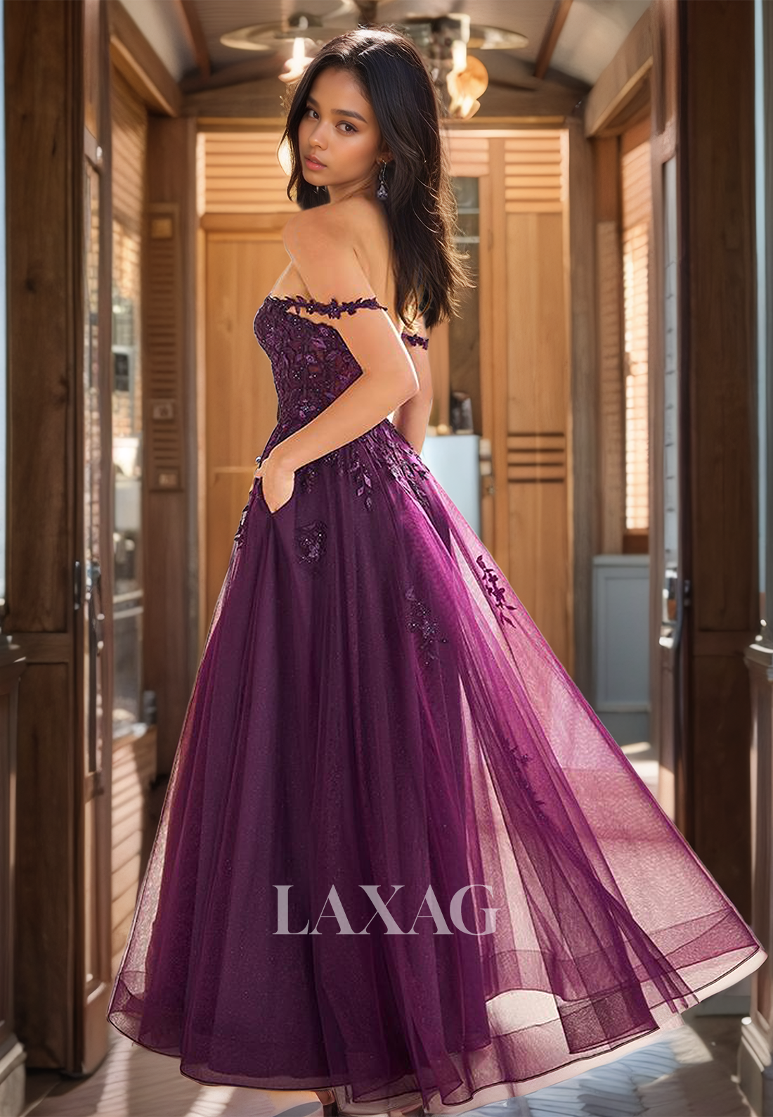 Spaghetti Straps Sleeveless Off-Shoulder A-Line Prom Dress Sweetheart Pleated Applique Floor-Length Party Gowns