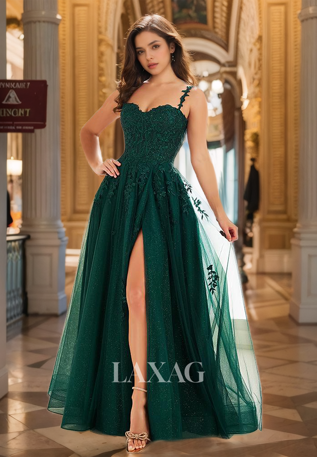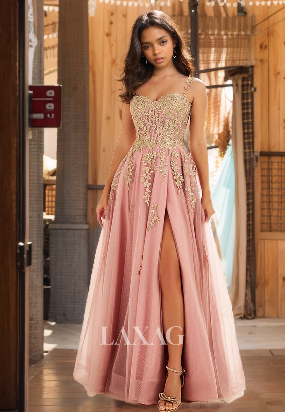 Elevate your style with our Spaghetti Straps Sleeveless Off-Shoulder A-Line Prom Dress. The sweetheart neckline, pleated details, and applique add a touch of elegance. Perfect for any party, it's floor-length design will make you stand out. Embrace glamour and confidence with this stunning gown.