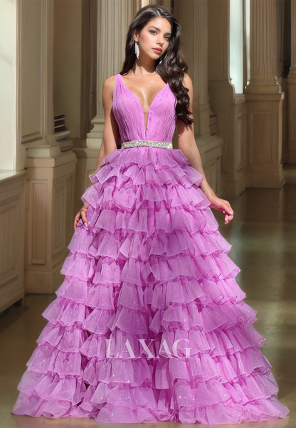 Effortlessly elegant and luxurious, our Deep V-Neck A-Line Prom Dress features spaghetti straps, glitter-knit fabric, and intricate beading. Sleeveless for ultimate comfort, and pleated for a flattering silhouette. Perfect for any special occasion, this dress is sure to make you stand out with style and grace.