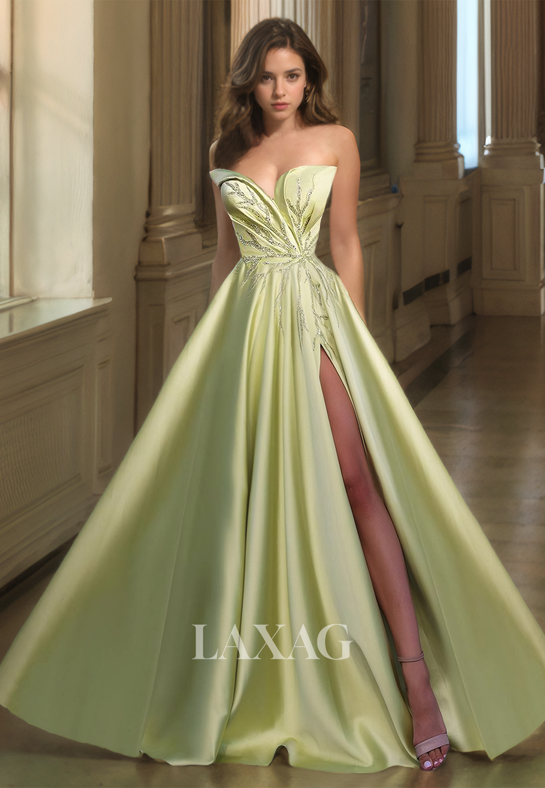 Sweetheart Sleeveless Satin A-Line Prom Dress Pleated Beaded Floor-Length Party Gowns with High Slit