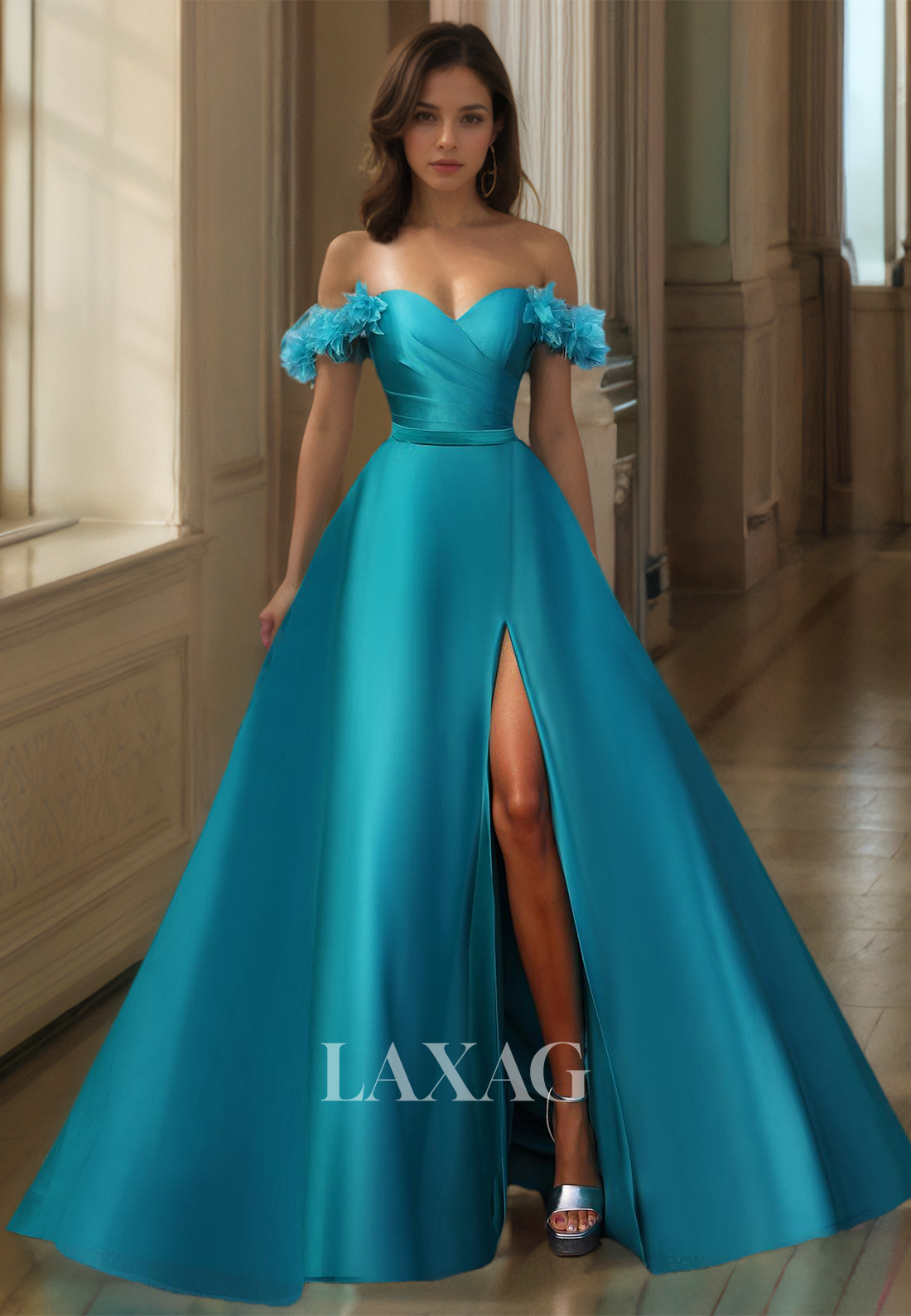 Sweetheart Off-Shoulder Pleated Party Dress Sleeveless Floor-Length A-Line Prom Dress with Floral Embellished
