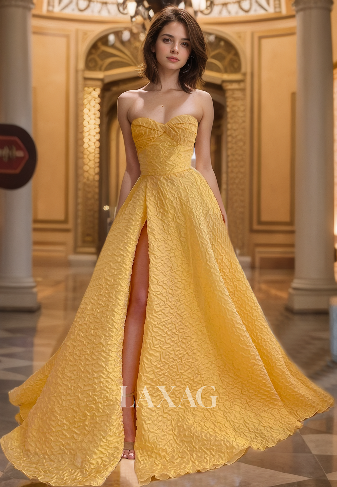 A-Line Sweetheart Off-Shoulder Sleeveless Pleated High Slit Chiffon Formal Prom Dress with Sweep Train
