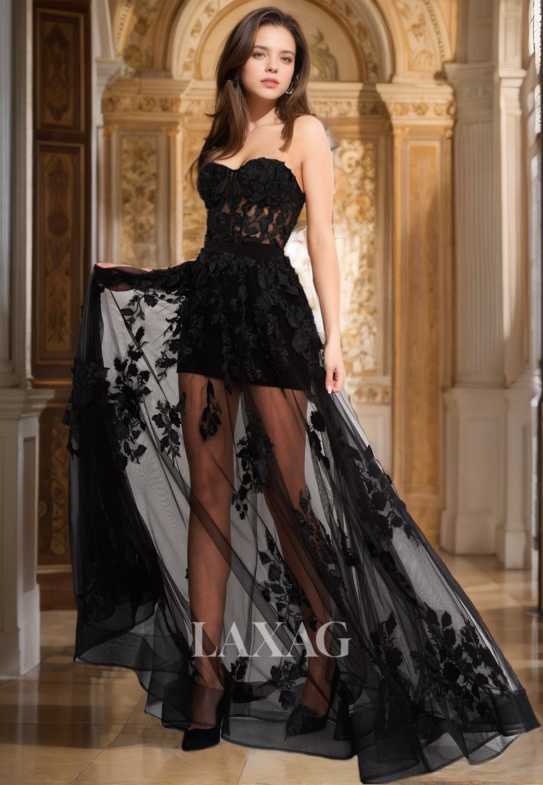 Sweetheart Off-Shoulder Sleeveless Lace Applique Pleated Short Prom Dress with Tulle Overskirt