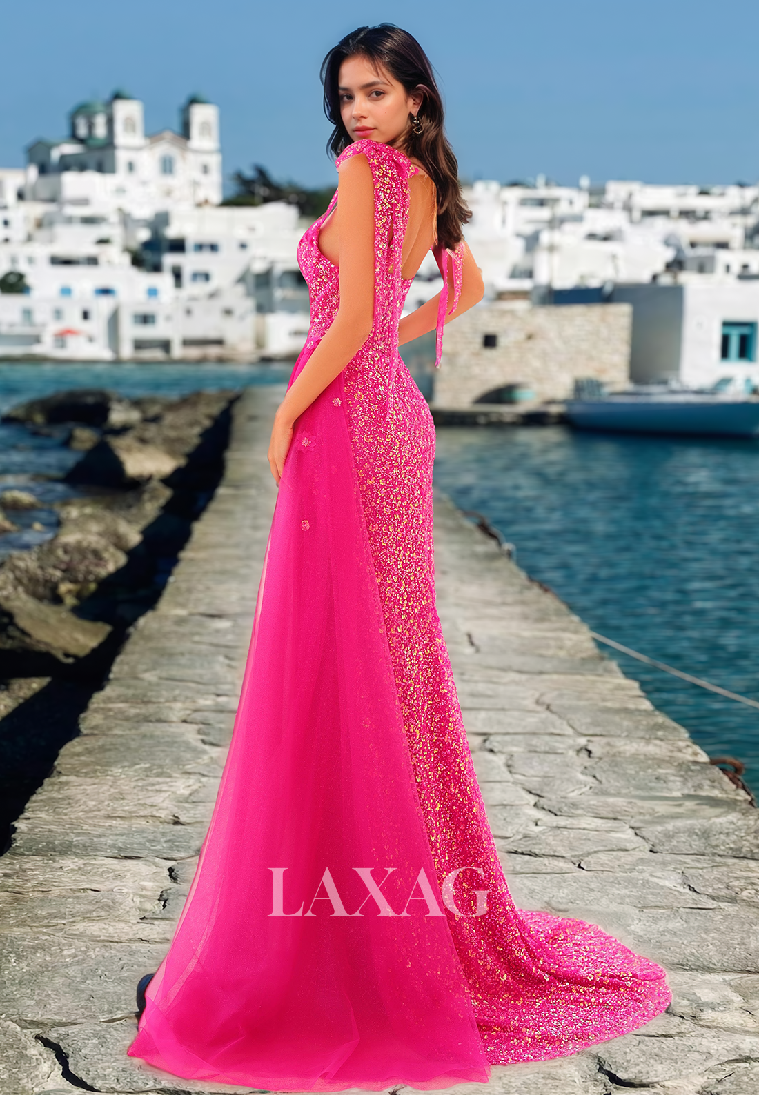Fully Sequined Sweetheart Sleeveless Party Gowns Spaghetti Straps Pleated Tulle Mermaid Prom Dress