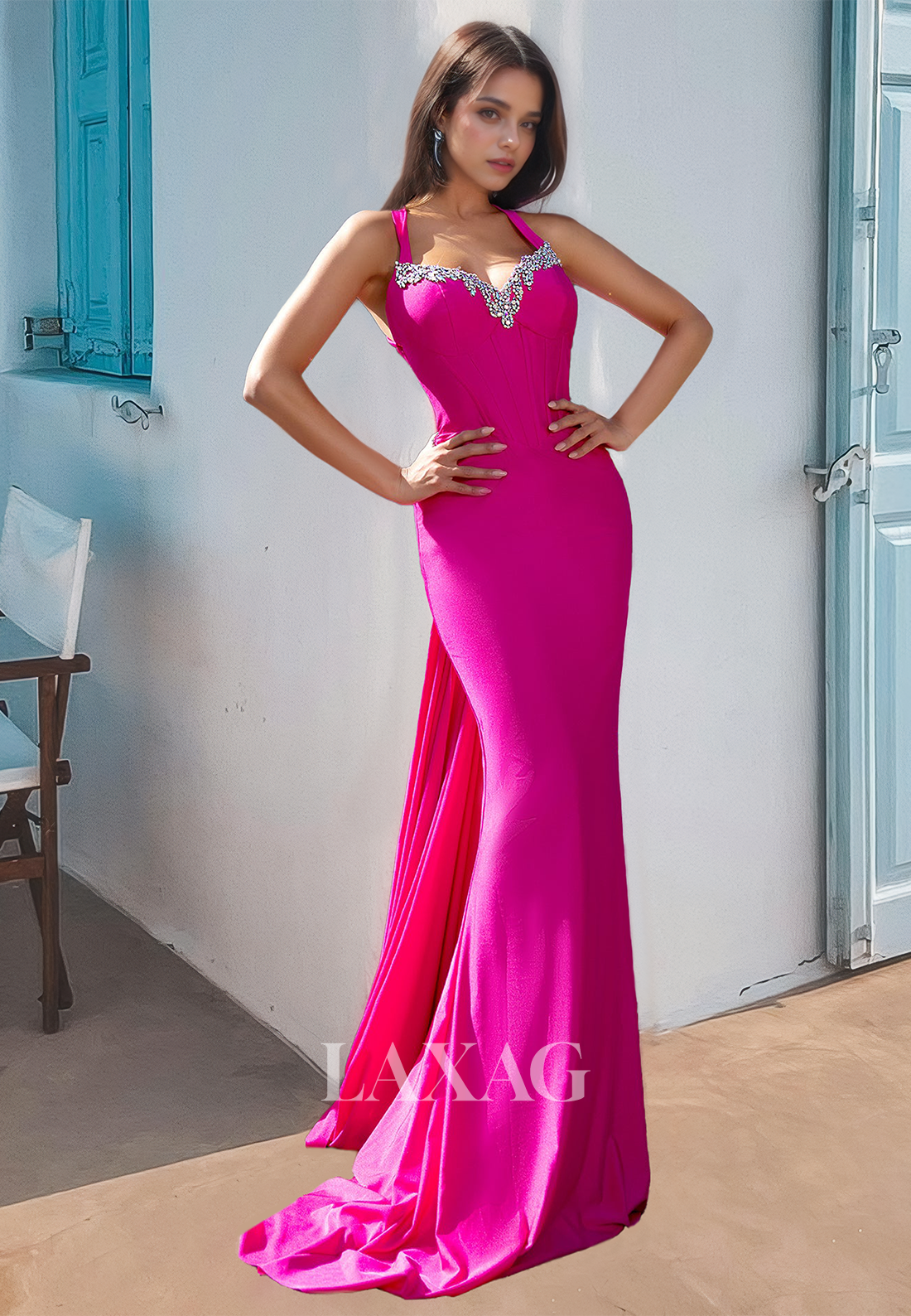 Beaded Sweetheart Sleeveless Satin Mermaid Prom Dress Spaghetti Straps Sweep Train Evening Gowns