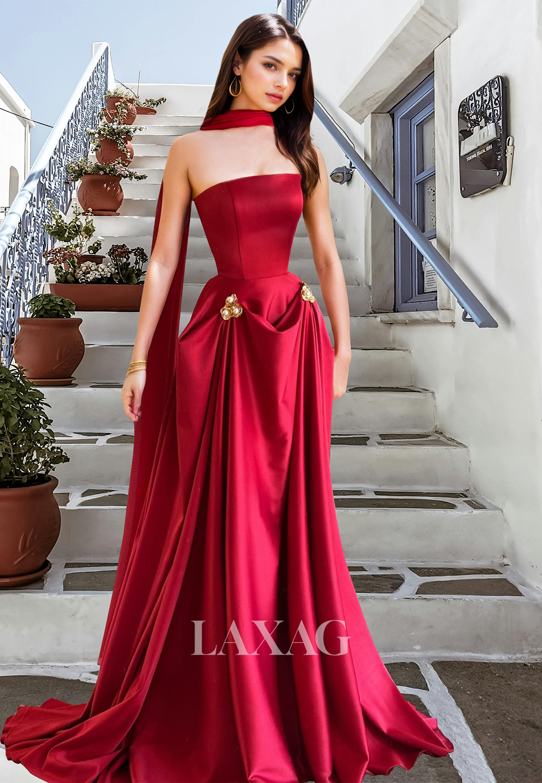 Tube Top Off-Shoulder Sleeveless A-Line Prom Dress Metallic Floral Embossed Pleated Party Gowns