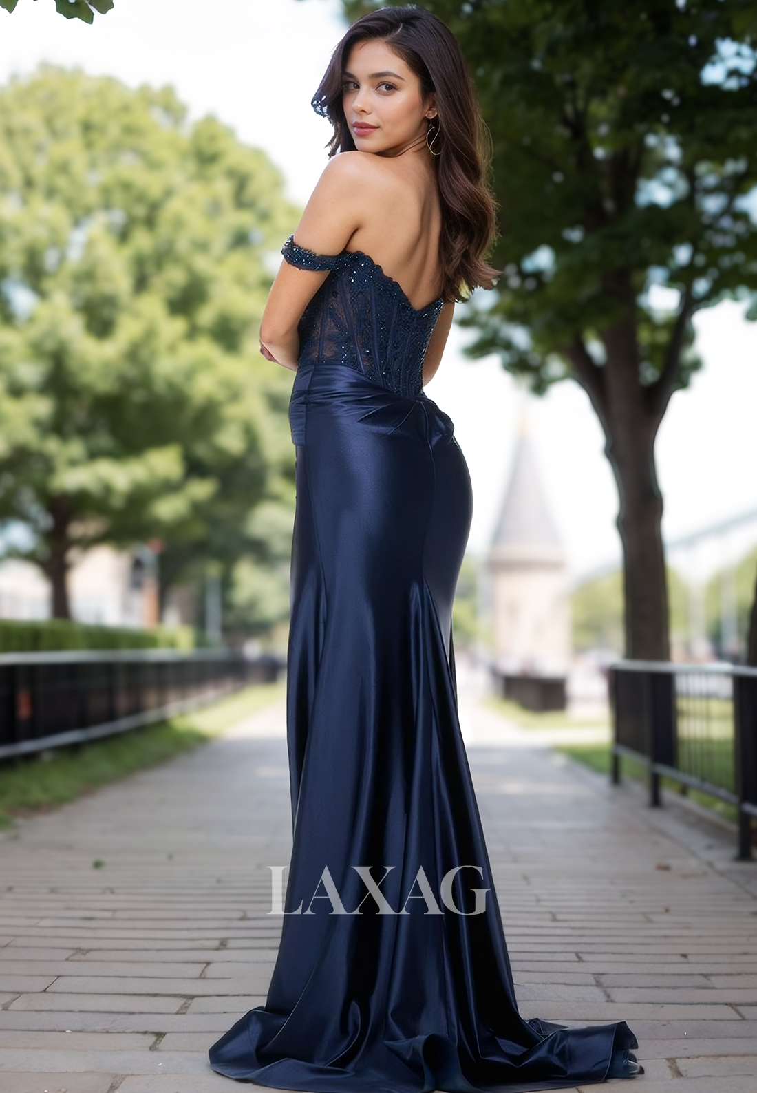 Off-Shoulder Sleeveless Pleated Mermaid Prom Dress Sweetheart Beaded Sequined Evening Gowns