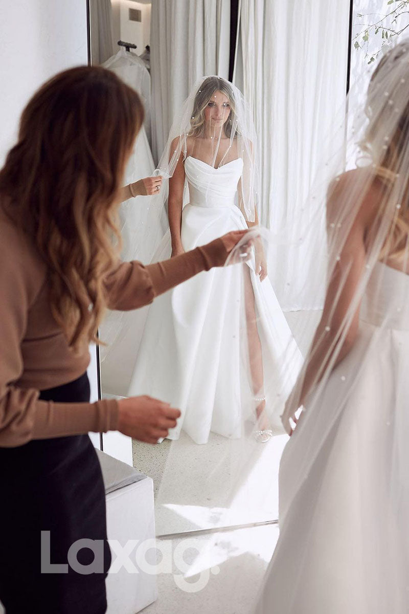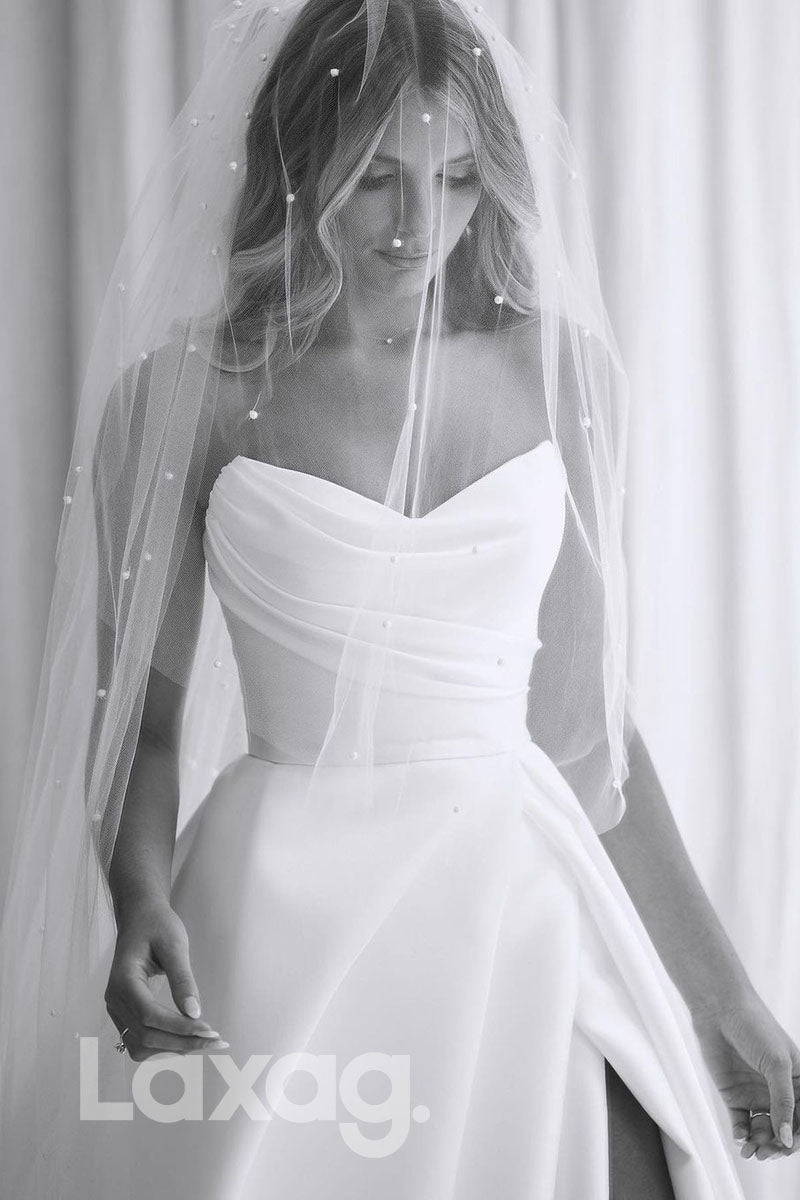 Details: A-line, Strapless, Sleeveless, Lace, Sweep Train, Lace-Up, Split, Pleats