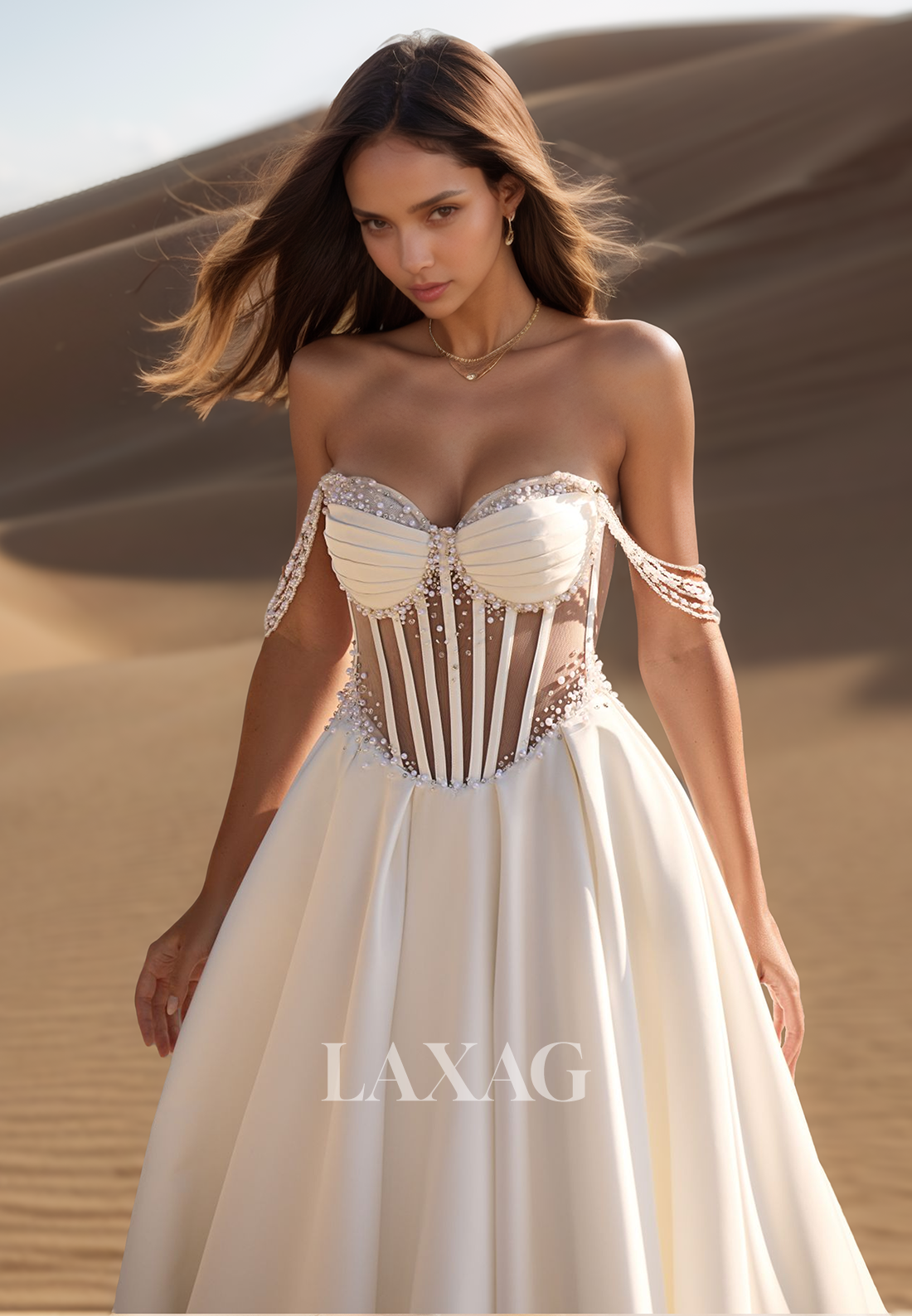 Sweetheart Sleeveless Off-Shoulder A-Line Wedding Dress Beaded Pleated Sheer Satin Bride Gowns