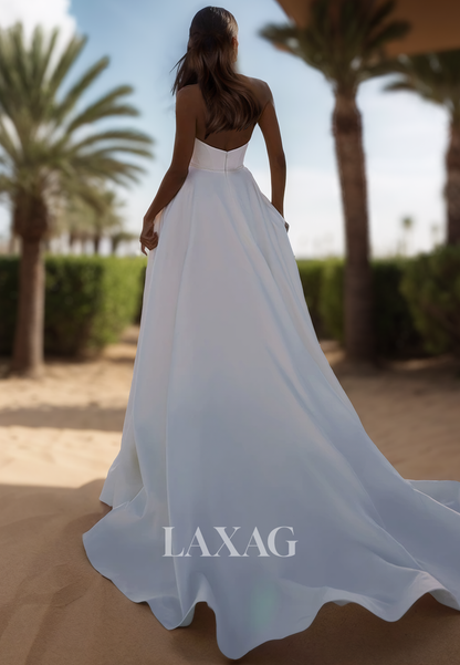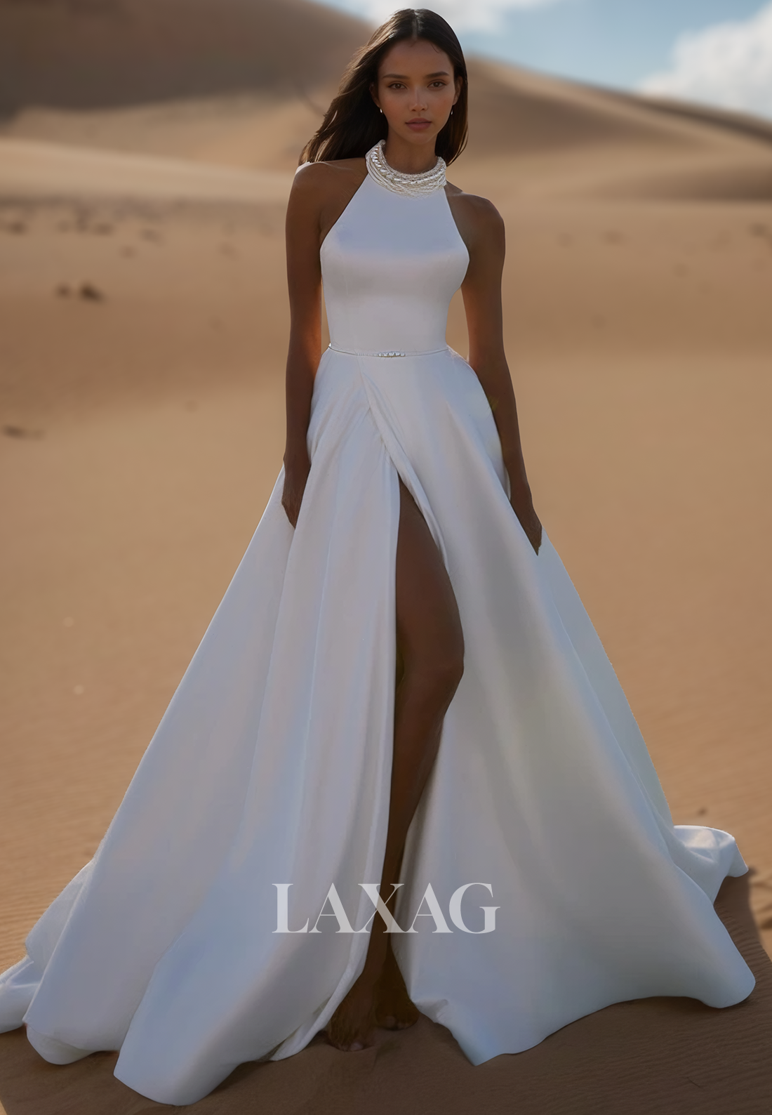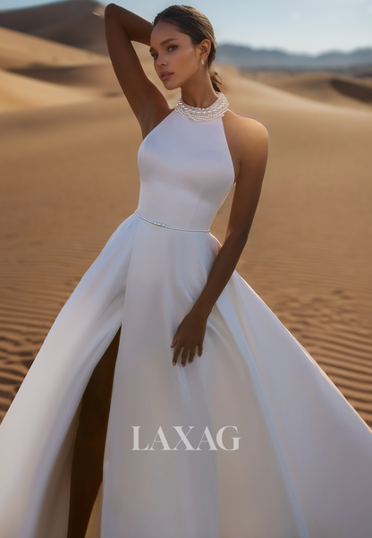 Halter-Neck Off-Shoulder Sleeveless Satin A-Line Wedding Dress Beaded Pleated High Slit Bride Gowns