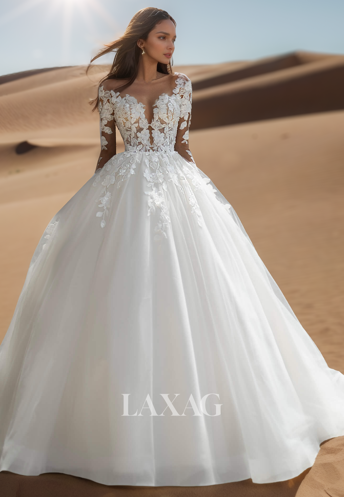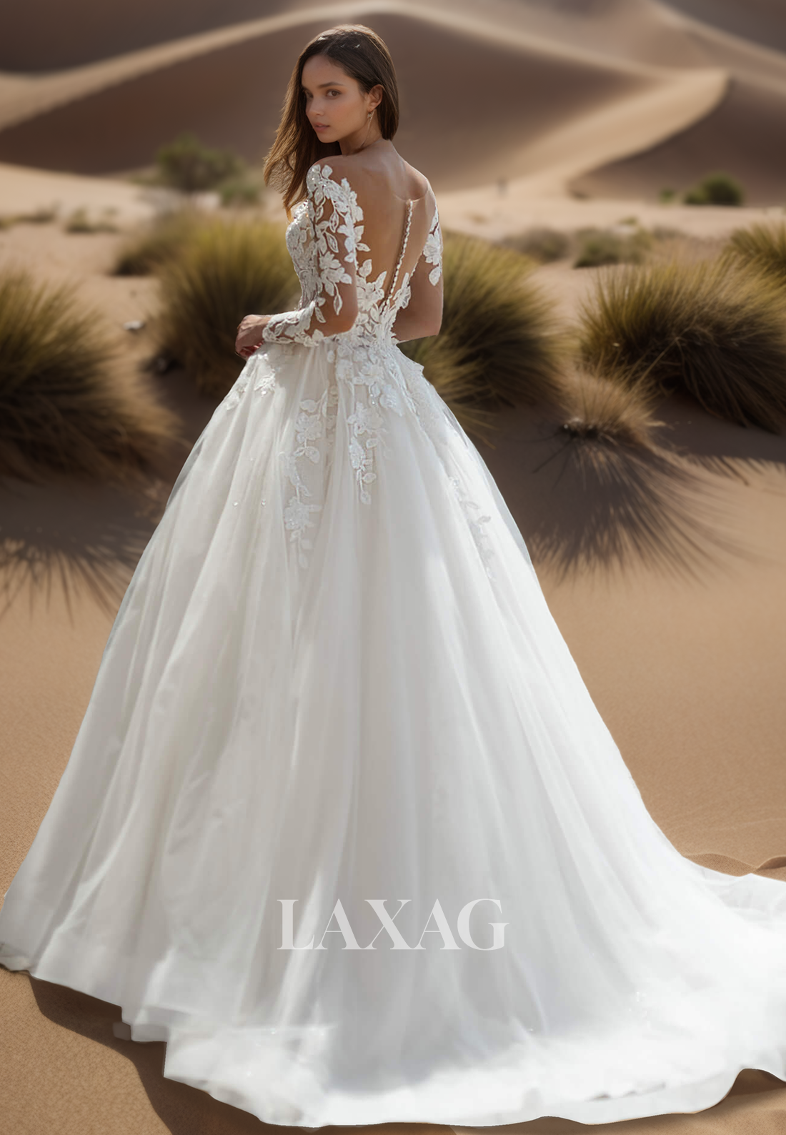 Sweetheart Long-Sleeves Applique Sequined Bride Gowns Pleated Cutout Tulle A-Line Wedding Dress