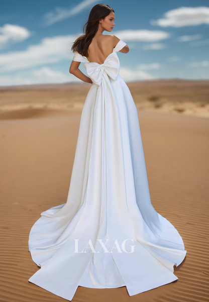 A-Line Sweetheart Off-Shoulder Sleeveless Beaded Applique Pleated Sweep Train Satin Wedding Dress with Big Bow