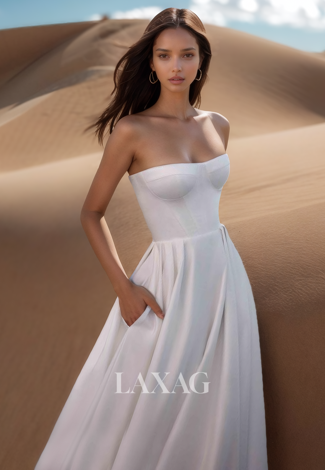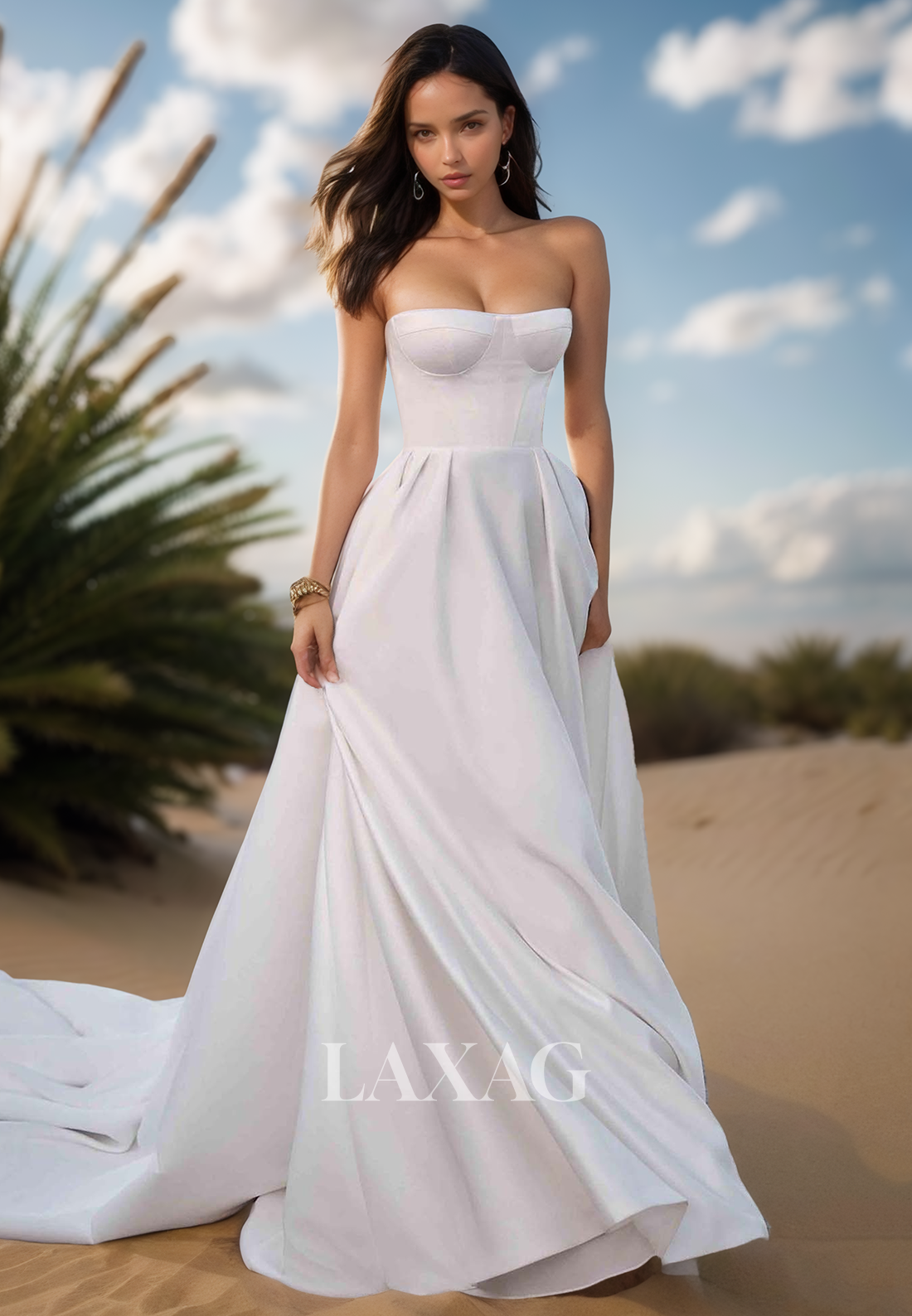 A-Line Tube Top Off-Shoulder Pleated Bride Gowns Sleeveless Satin Sweep Train Wedding Dress