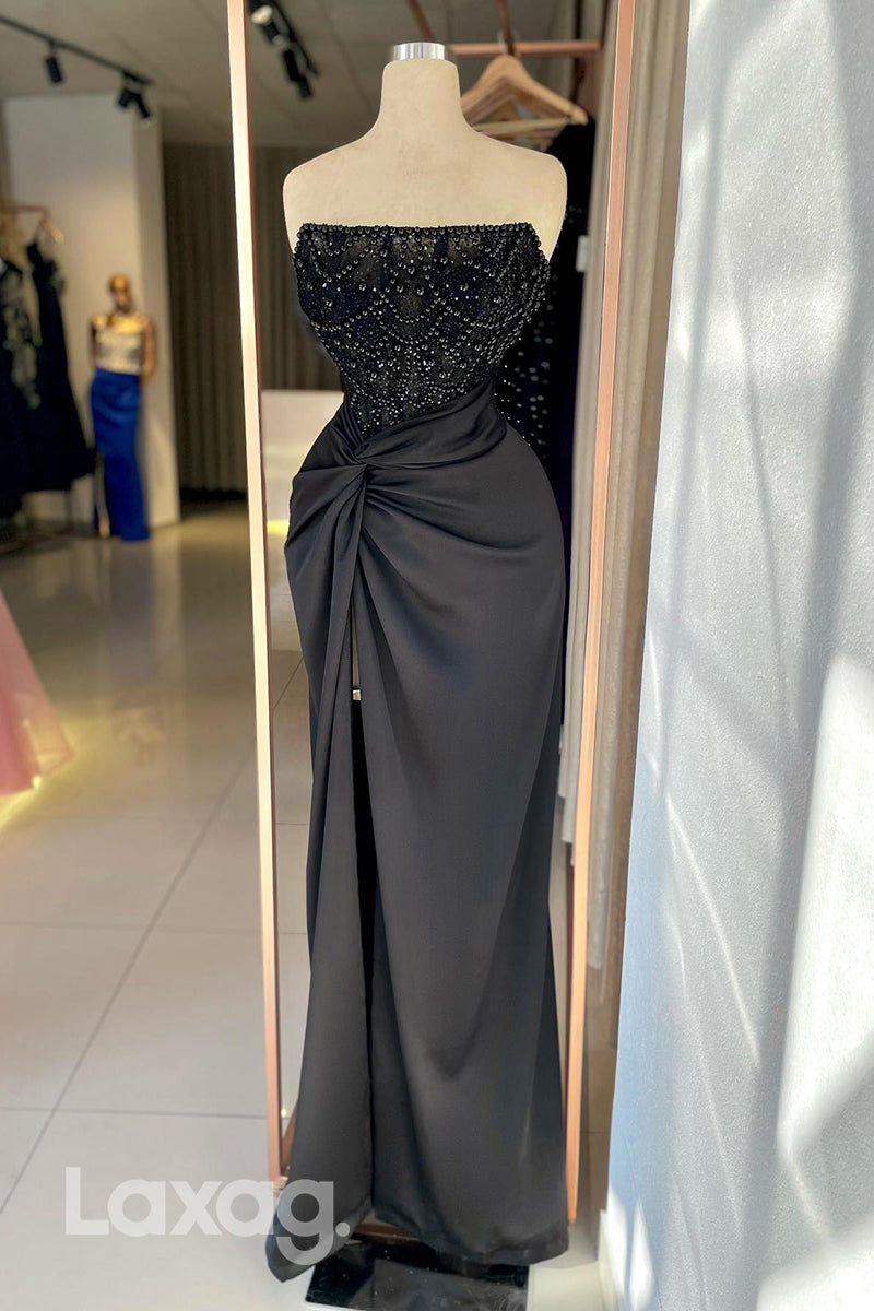 Strapless Beads Bodice Black Long Formal Evening Party Dress