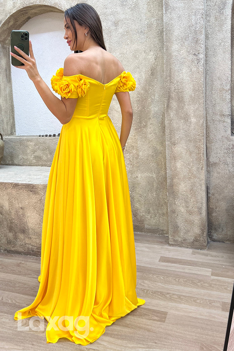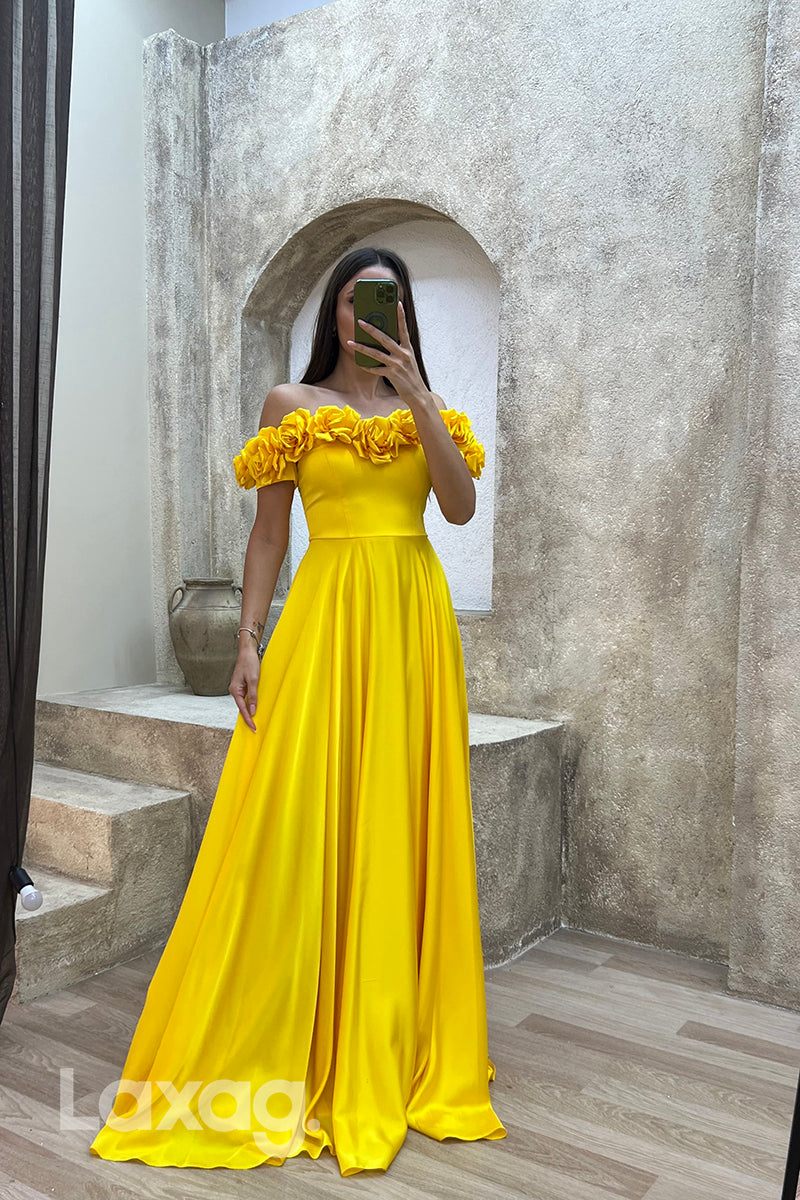 22071 - A Line Off Shoulder Flowers Long Formal Prom Dress
